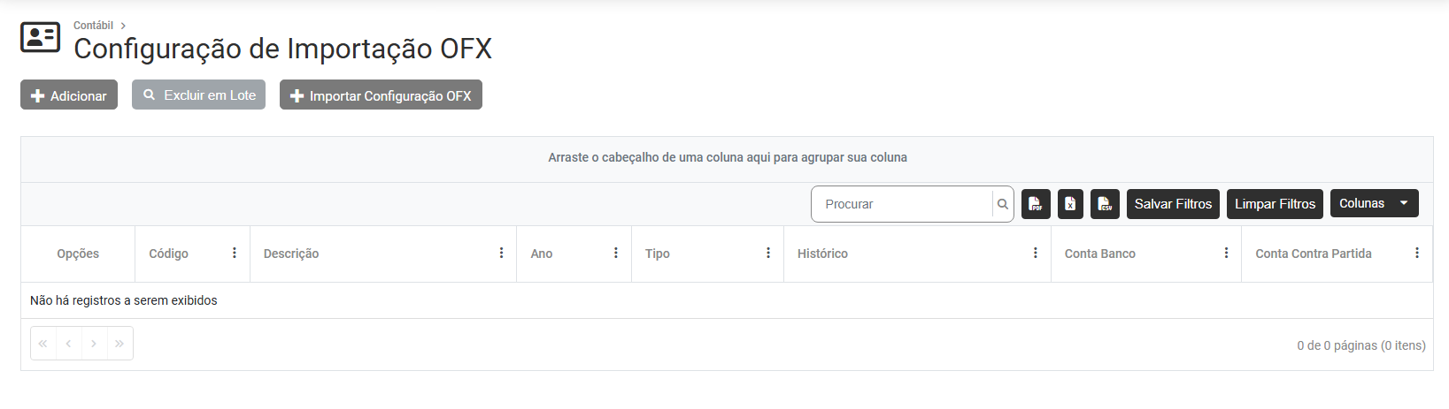 Para realizar a configuração de importação de arquivos na extensão OFX (formato de arquivo padrão internacional, criado para trocar informações financeiras entre bancos e softwares) você deverá acessar o menu Cadastros>Configuração de Importação OFX