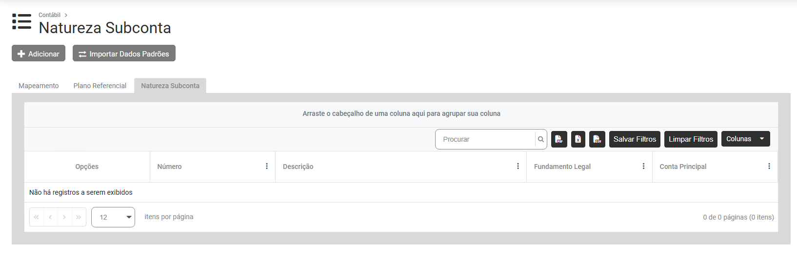 Ao clicar no botão Importar Dados Padrões, o Sistema fará a importação das Naturezas da Subconta padrões existente