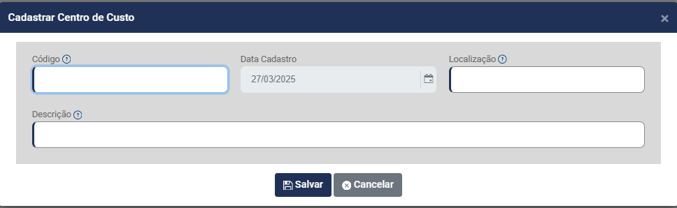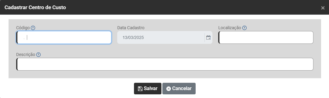 - Data de Cadastro (não será possível realizar cálculos para esse Centro de Custo em data anterior a que for definida neste campo)
