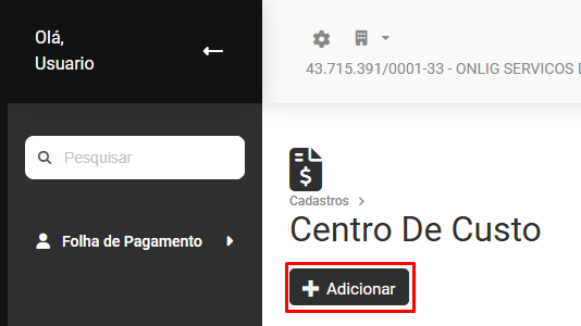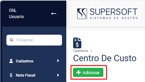 Será apresentada a dela de Centro de Custo, clique no botão "Adicionar"