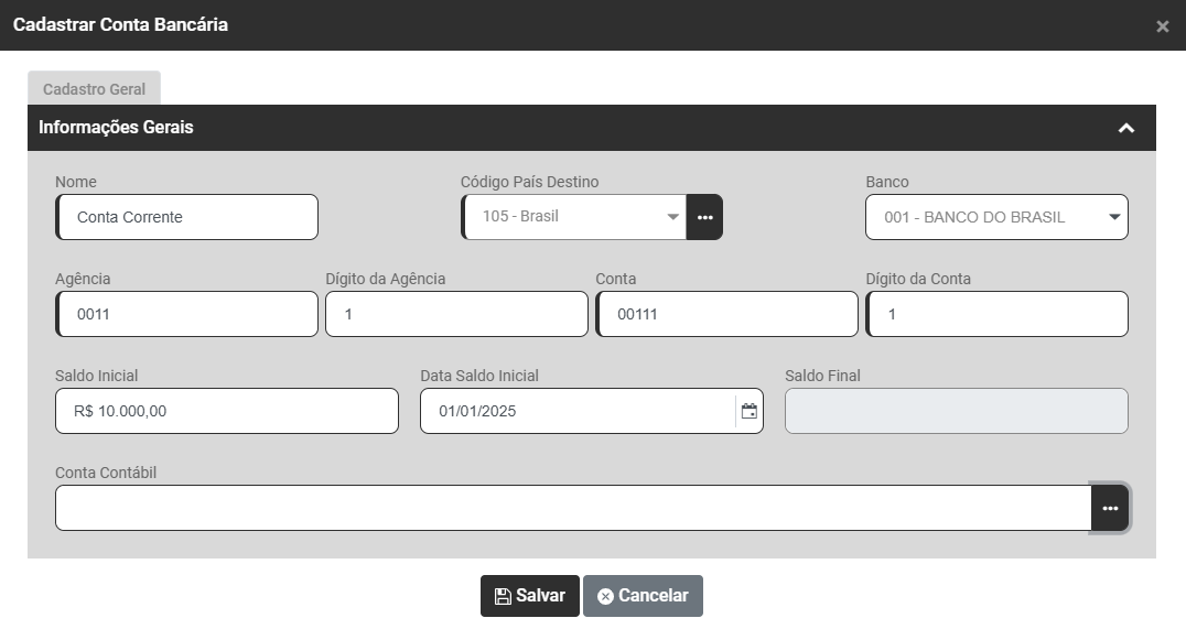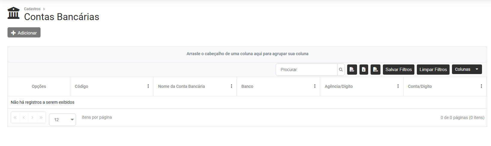 Ao clicar no botão Adicionar será apresentada a tela para Cadastrar Conta Bancária