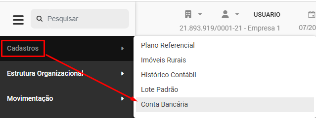 Para cadastrar as Contas Bancárias da Empresa acesse o menu Cadastros>Conta Bancária