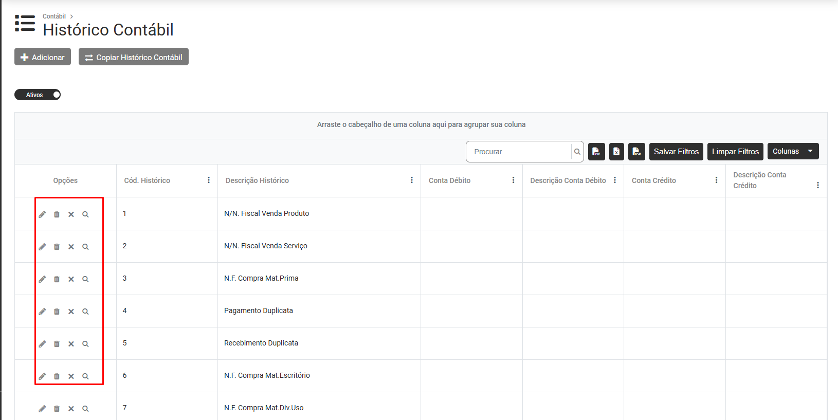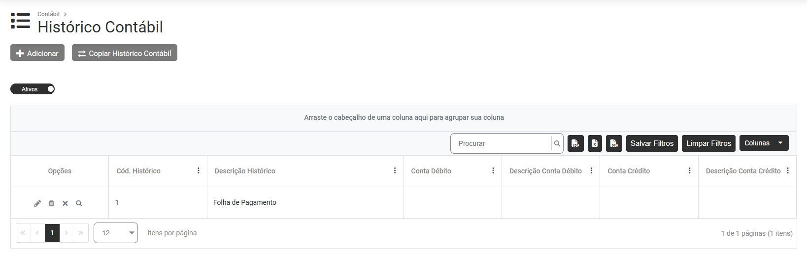 Na parte superior da tela, você encontrará dois botões - Adicionar e Copiar Histórico Contábil