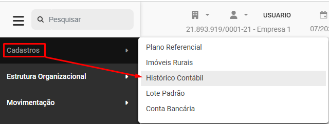 Para cadastrar os Históricos Contábeis da Empresa, acesse o menu Cadastros>Histórico Contábil