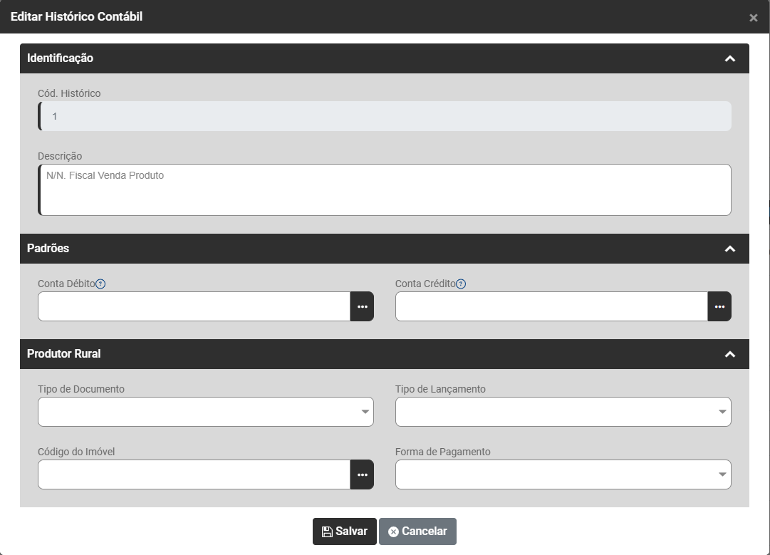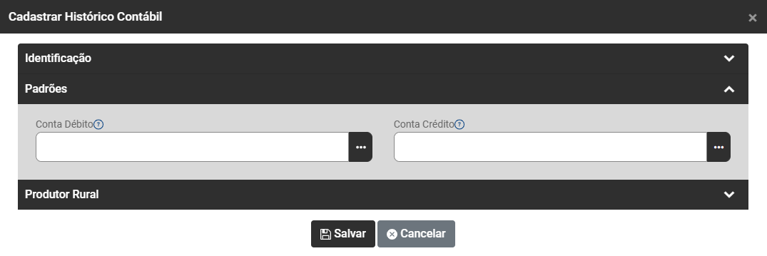 - Conta de Crédito - Preencha uma Conta Contábil para levar automaticamente no lançamento contábil como crédito ao incluir esse histórico.