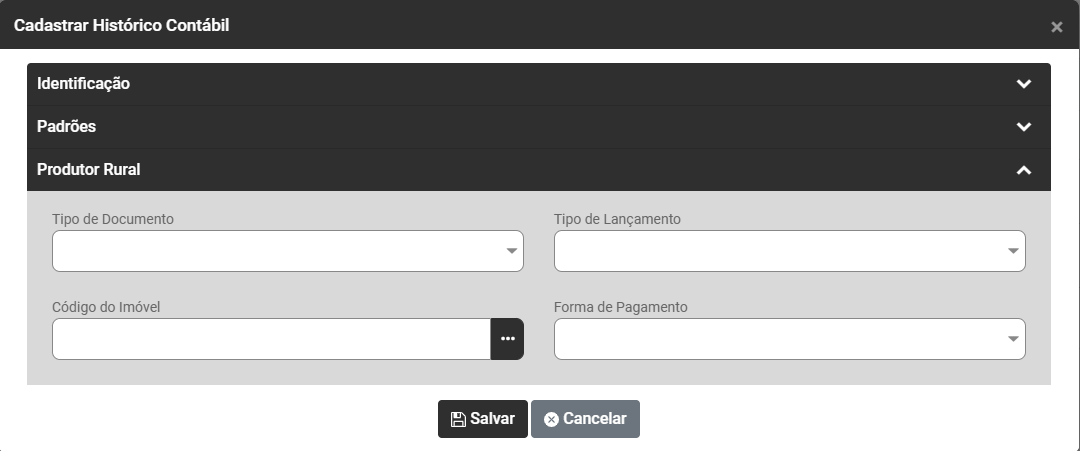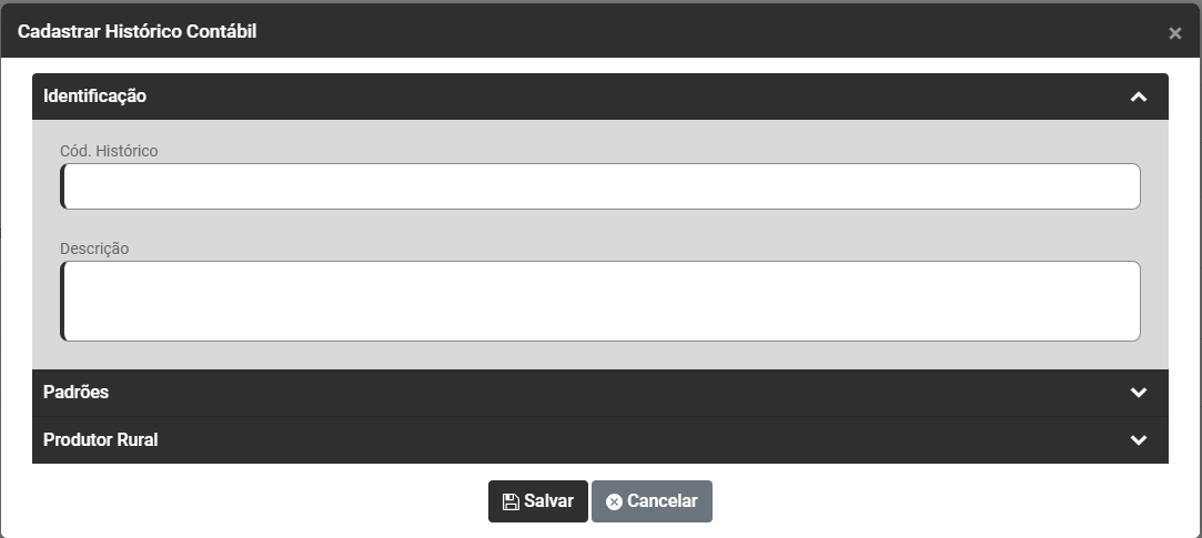 Ao clicar no botão Adicionar será aberta a tela de Cadastro do Histórico Contábil, informe: