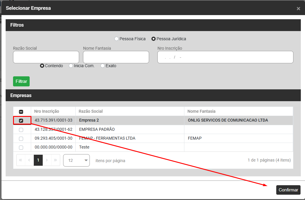 Ao clicar no botão Copiar de Outra Empresa o Sistema apresentará a tela para que você defina de qual empresa serão copiadas as informações do Cadastro de Imóveis Rurais, selecione a empresa e clique em confirmar