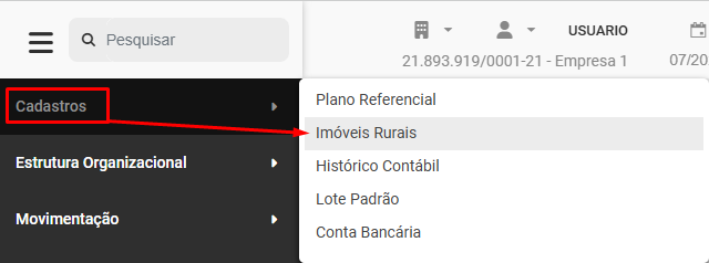 Para cadastrar os Imóveis Rurais da Empresa, acesse o menu Cadastros>Imóveis Rurais
