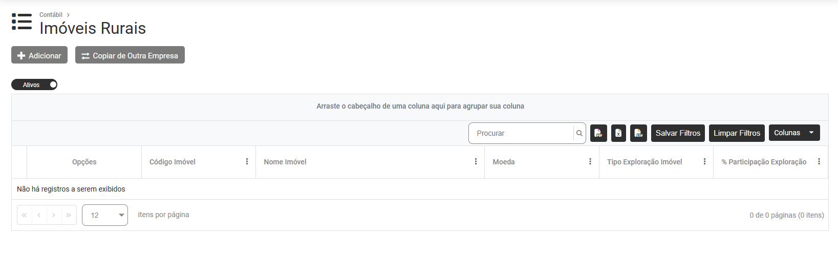 Na parte superior da tela você encontrará 2 botões - Adicionar e Copiar de Outra Empresa