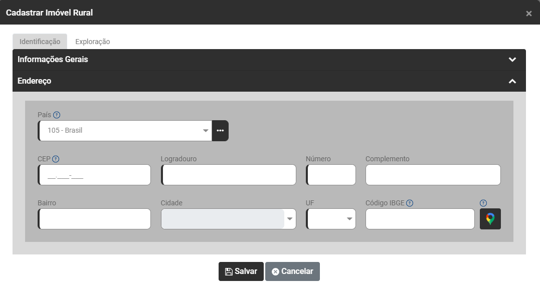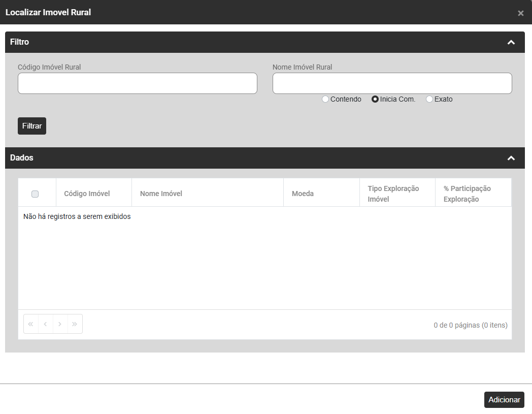 Ao clicar no botão Adicionar será aberta a tela para que você cadastre o Imóvel Rural