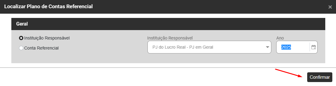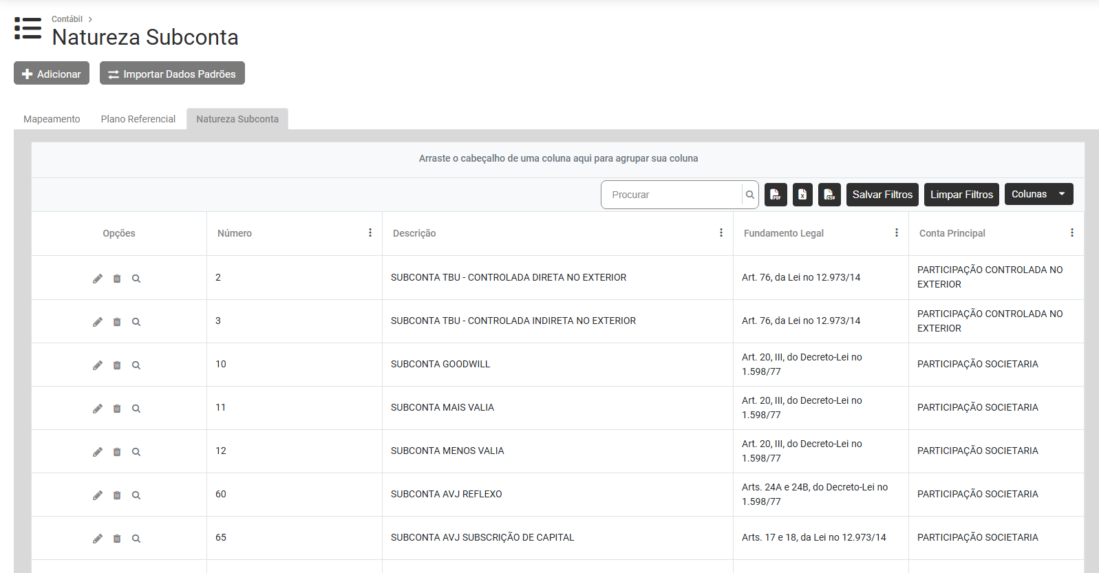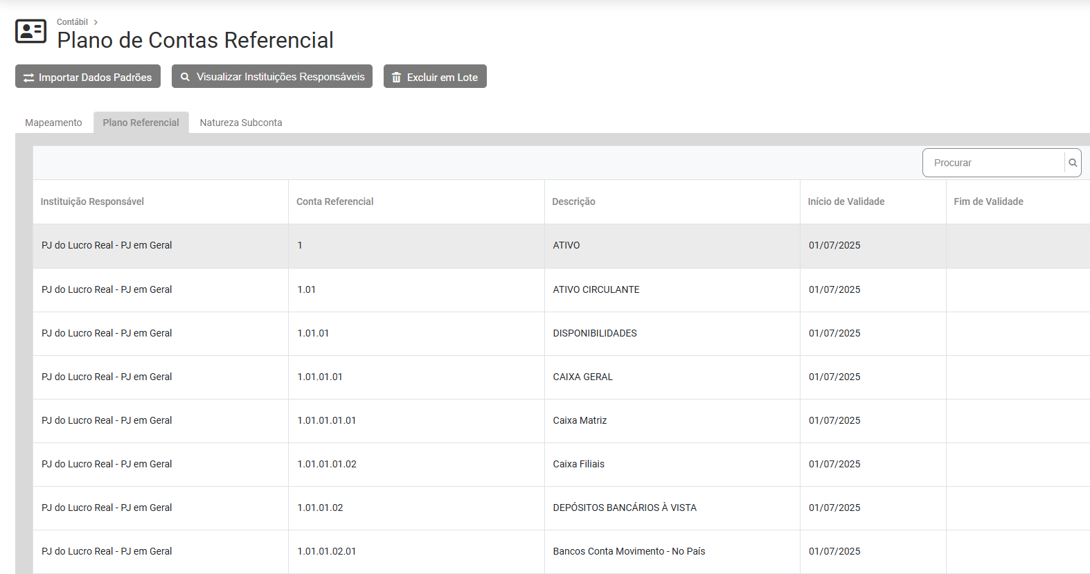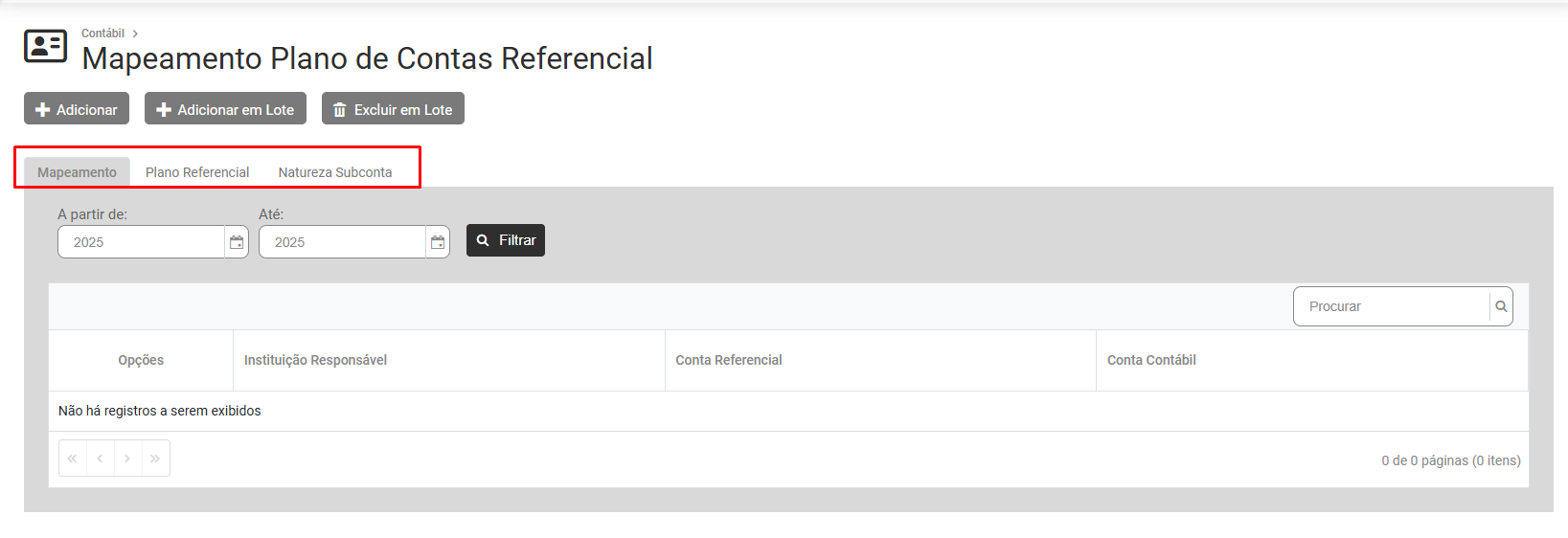 Será apresentada a tela do Mapeamento do Plano de Contas Referencial contendo 3 abas:
