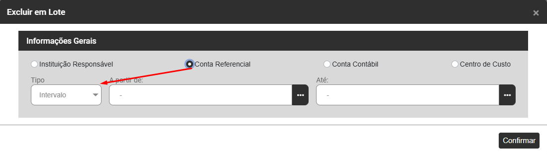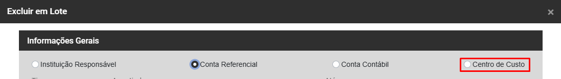 Ao clicar no botão Excluir em Lote da Aba Mapeamento será apresentada a tela para Excluir em Lote/Informações Gerais, para que seja definido se a exclusão será pela:
