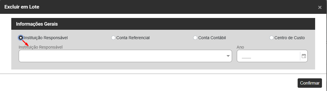 Ao clicar no botão Excluir em Lote será apresentada a tela para que você defina a Instituição Responsável que deseja excluir e em seguida o ano da exclusão, após a definição clique em confirmar e a exclusão será realizada