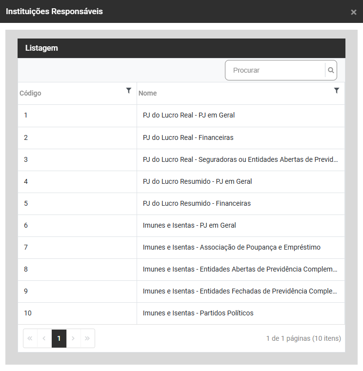 Ao clicar no botão Visualizar Instituições Responsáveis, o Sistema apresentará a tela contendo todas as Instituições Responsáveis