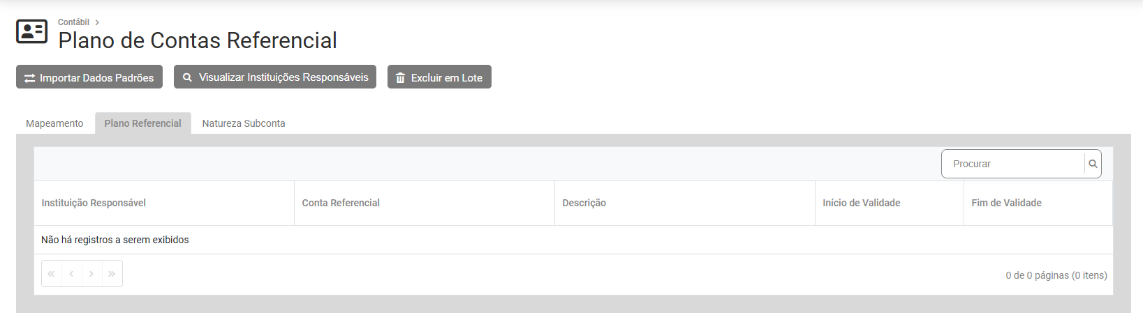 Será apresentada a tela do Mapeamento do Plano de Contas Referencial contendo 3 abas: