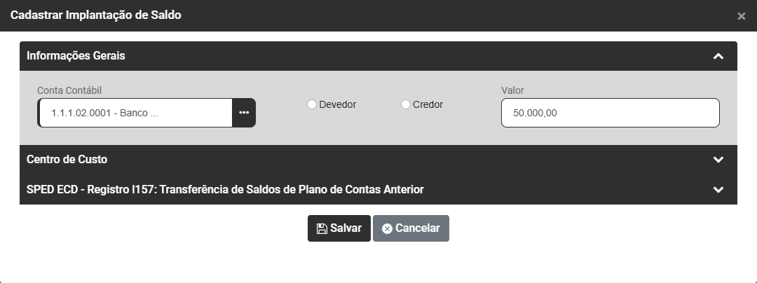 1) Ao acessar o botão Adicionar o sistema irá apresentar a tela para Cadastrar a Implantação de Saldo