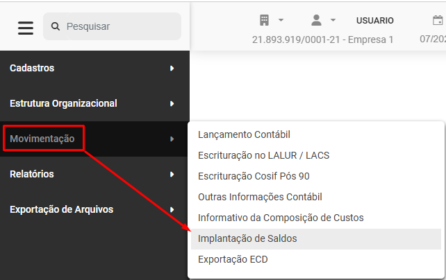 Para realizar a Implantação dos Saldos das Contas Contábeis acesse o menu Movimentação>Implantação de Saldos