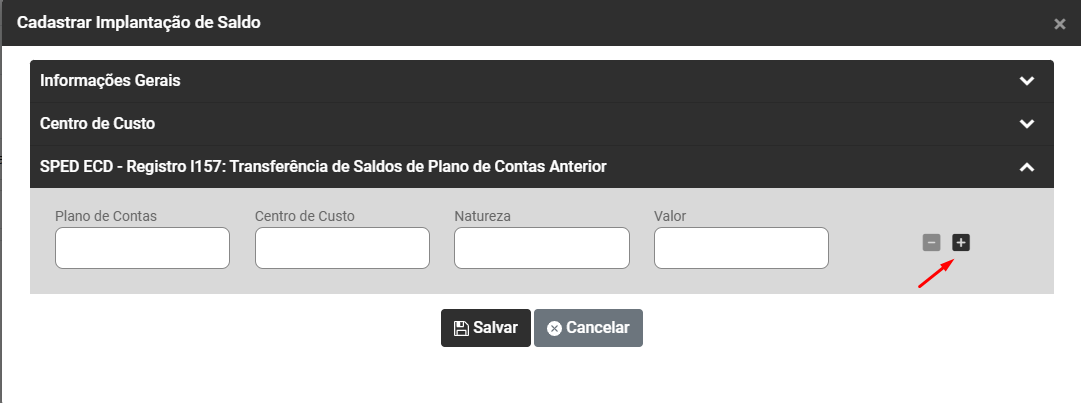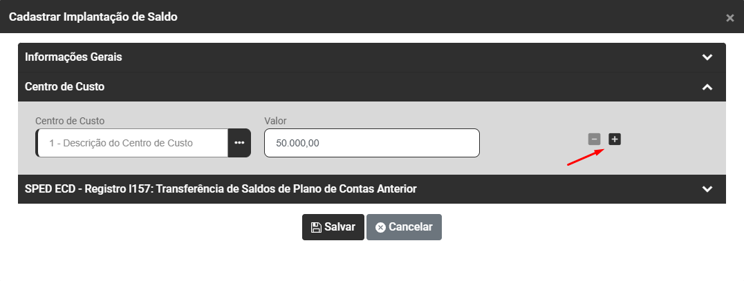 IMPORTANTE - Para que você informe saldo dessa mesma conta contábil para outro Centro de Custo, clique no botão (+)