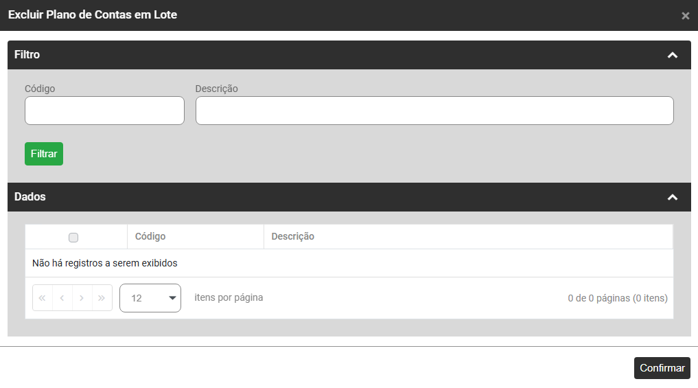 2) Ao acessar o botão Excluir em Lote o Sistema apresentará a tela pra que você defina o Filtro das informações que deseja excluir no Sistema, após a definição da exclusão clique em Confirmar