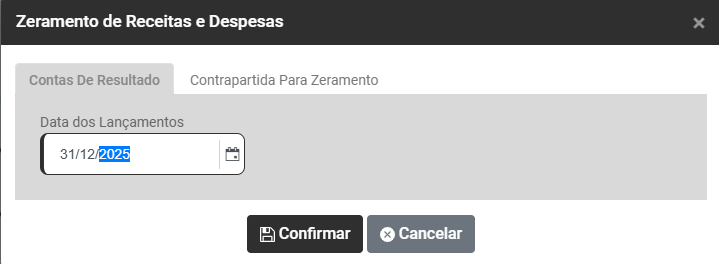 Para que você realize o Zeramento das Contas Contábeis e a transferência de seus saldos para a Conta de Resultado do Exercício você deverá informar: