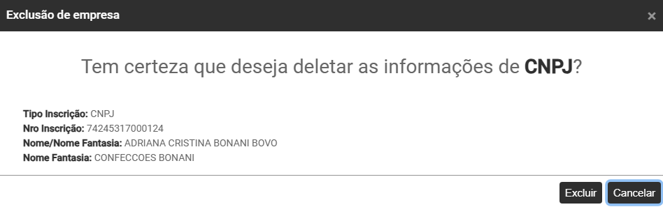 O Sistema questionará se você tem certeza que deseja deletar as informações do CNPJ