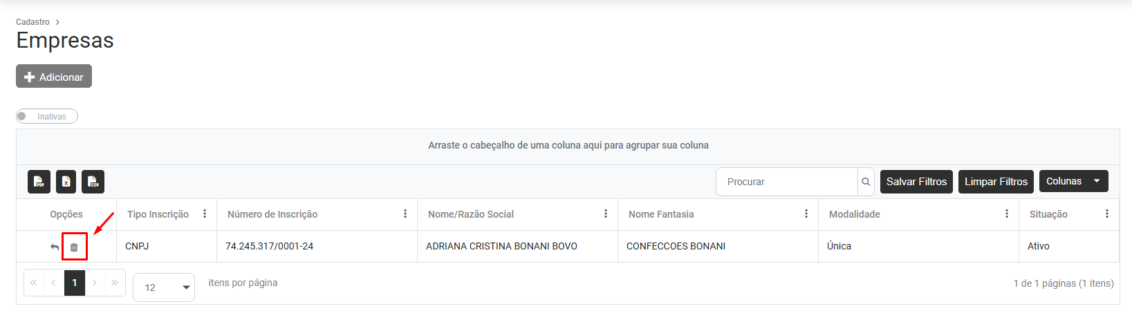 2) Para Excluir uma empresa Inativa clique no botão Excluir