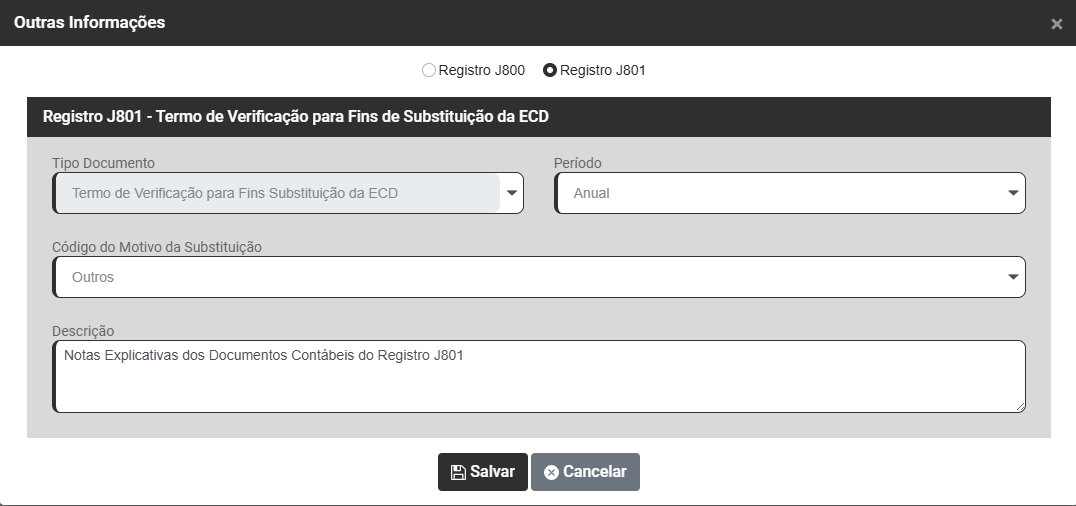 2) REGISTRO J801 - Termo de Verificação para Fins de Substituição da ECD, Utilizado na ECD para substituir uma Escrituração Contábil Digital já enviada