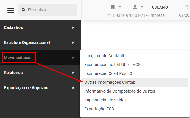 Para cadastrar Outras Informações Contábeis acesse o menu Movimentação>Outras Informações Contábeis