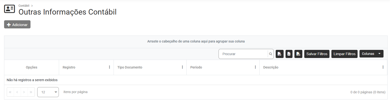 Ao acessar o botão Adicionar será apresentada a tela para cadastro das Outras Informações Contábeis, informe