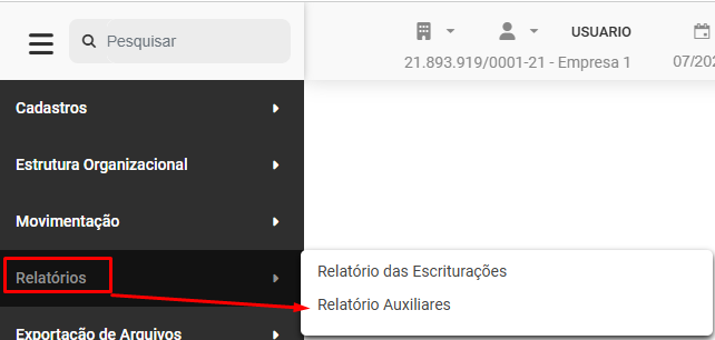Para visualizar ou imprimir os Relatórios Auxiliares você deverá acessar o menu Relatórios>Relatórios Auxiliares