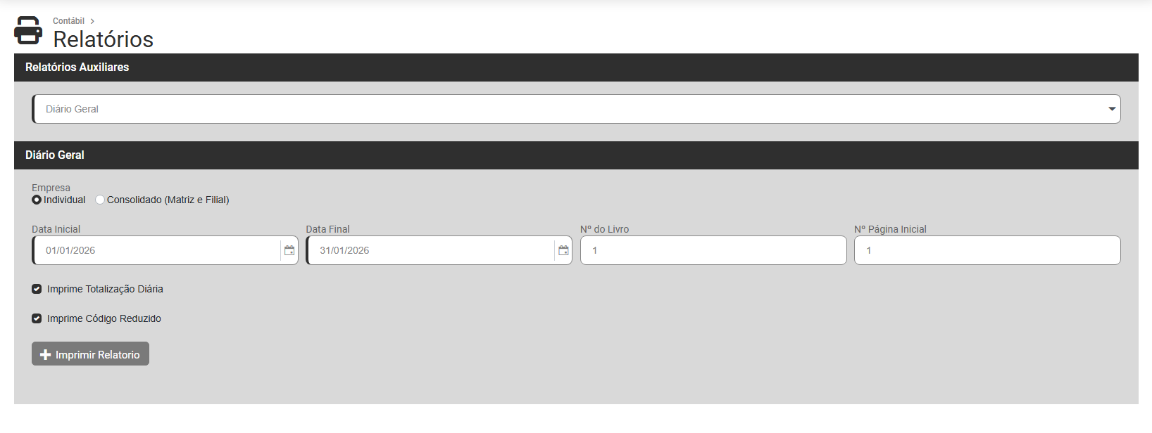 Ao definir Diário Geral será apresentada a tela para definição da configuração do Relatório, informe: