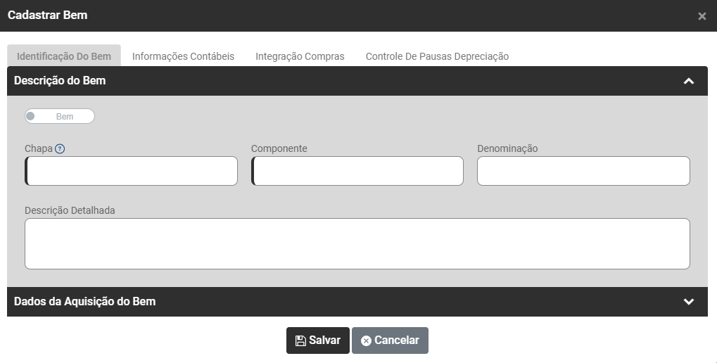 Ao clicar no botão Adicionar será apresentada a tela para cadastro do bem