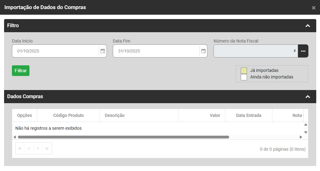 Ao clicar no botão Dados Compras será apresentada a tela para que você defina: