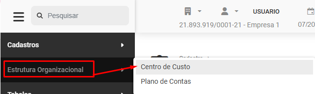 Para cadastrar os Centros de Custo acesse o menu Estrutura Organizacional>Centro de Custo