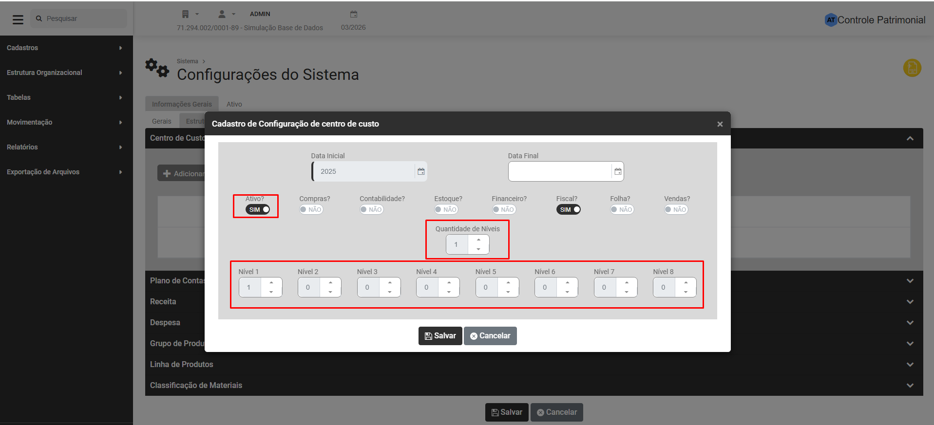 - Data de Cadastro do Centro de Custo - Não será possível utilizar esse Centro de Custo em data anterior a que estiver definida neste campo