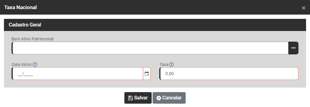 Ao clicar no botão Adicionar o Sistema apresentará a tela para Cadastro geral das Taxas de Depreciação, informe: