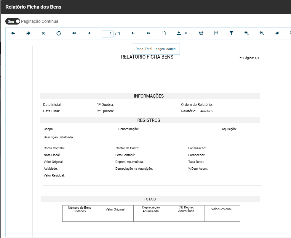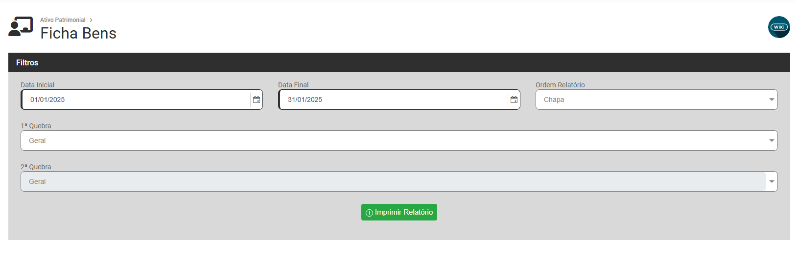 Para imprimir a Ficha de Bens acesse o menu Relatórios>Ficha de Bens