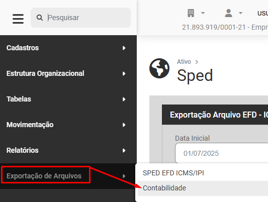Para que você realize a Exportação de Dados para o Sistema Contábil, acesse o menu Exportação de Arquivos>Contabilidade