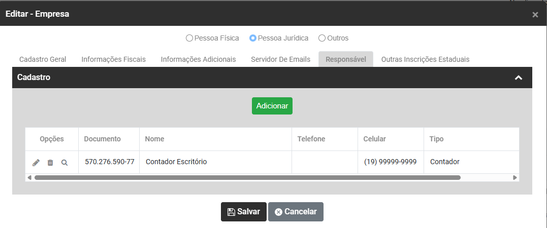 Em responsável você deverá cadastrar as informações dos Responsáveis pela Empresa, Pessoa registrada na Receita Federal que responde juridicamente pelo negócio/atividade da Empresa.
