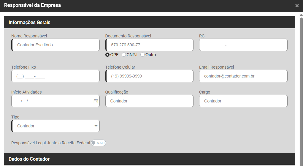 - Tipo - (Sócio, Contador, Auditor Fiscal, Preposto)