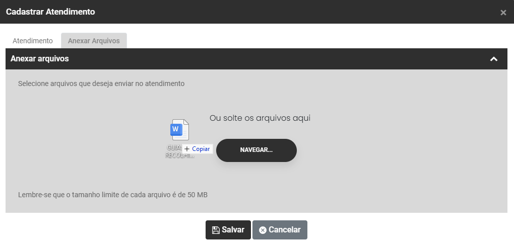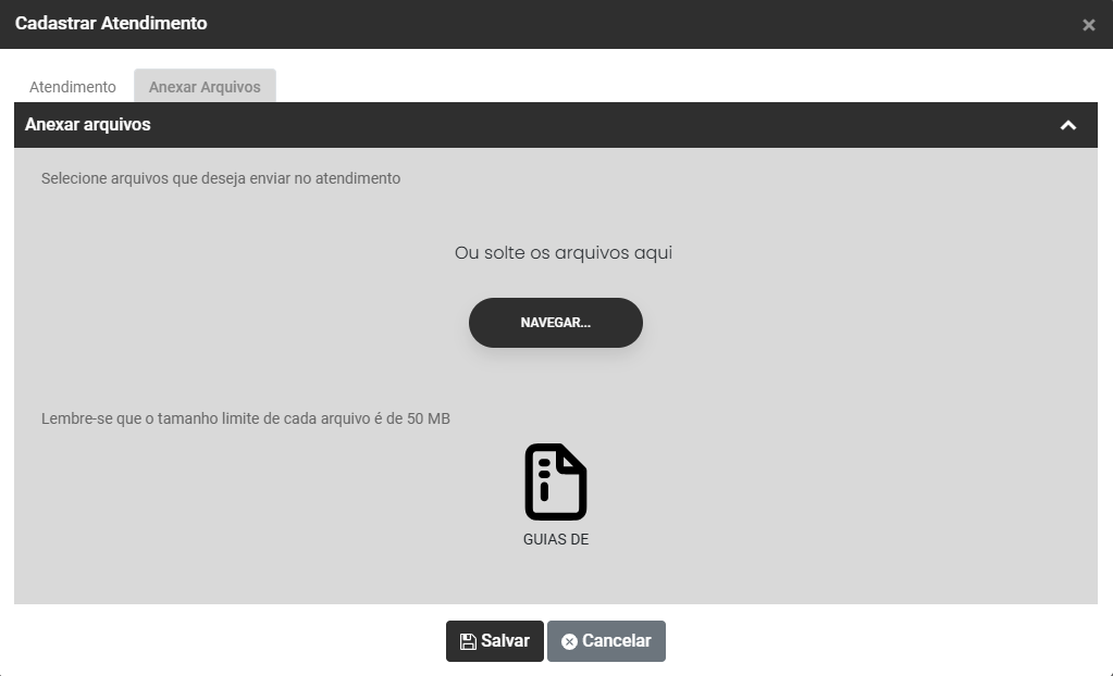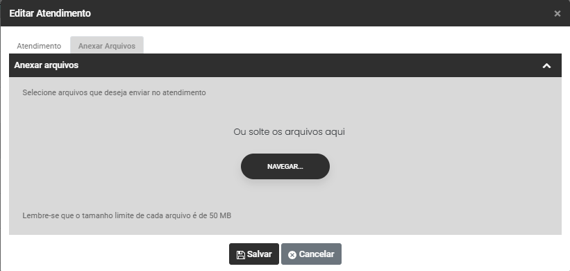 Você poderá anexar documentos ao Atendimento arrastando os arquivos ou navegando e procurando por eles