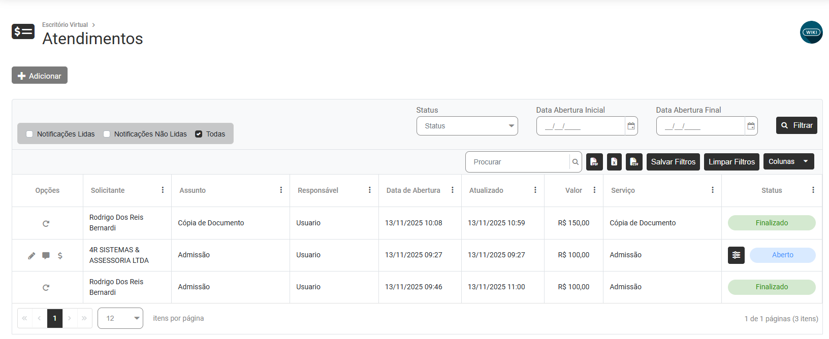 Quando você finalizar o cadastro do Atendimento irá notar que o mesmo consta do Grid da tela com Status Aberto
