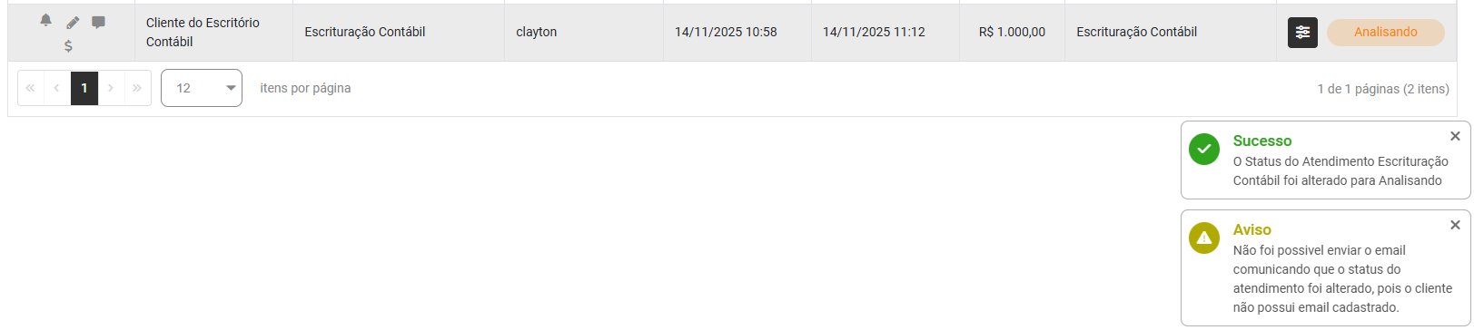 Quando você realizar a alteração do Status do Atendimento, o Sistema irá apresentar duas mensagens