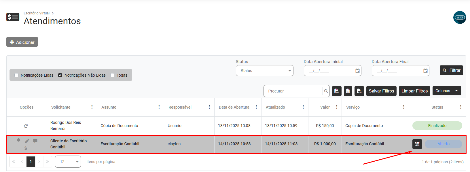- Editar - Abrir a tela com o cadastro do Atendimento para que você realize alterações no mesmo