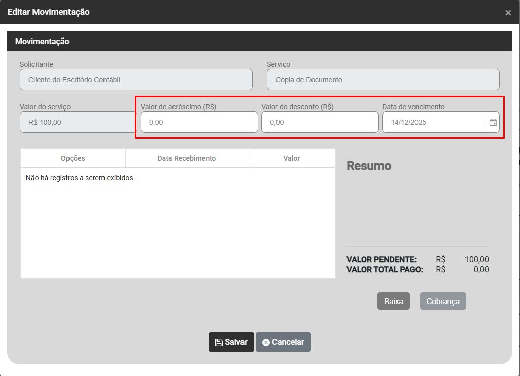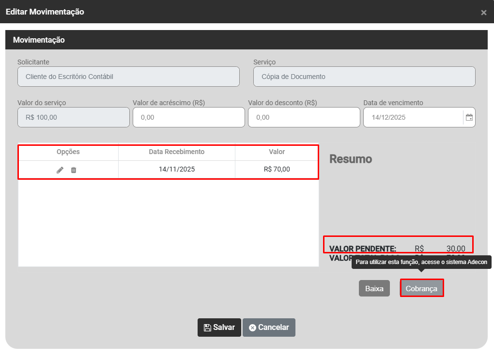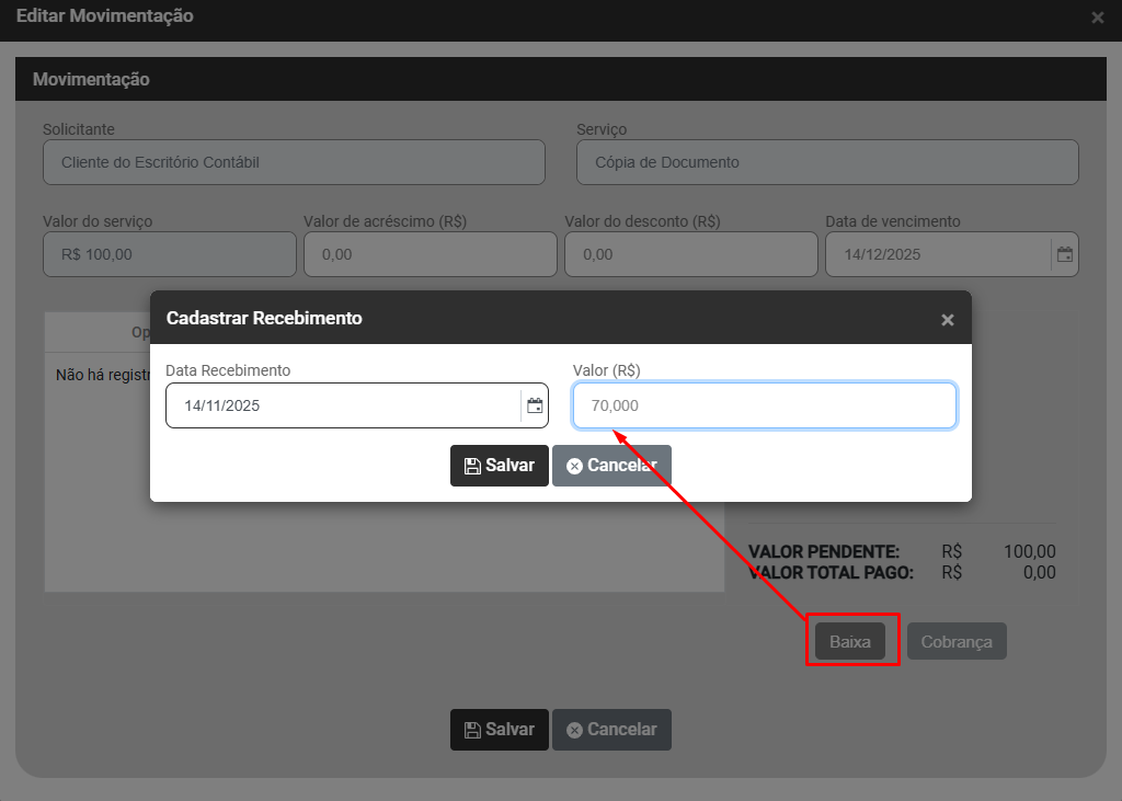 Para realizar a baixa da Movimentação do Cliente (possível apenas se o Escritório Contábil NÃO utilizar o Sistema Adecon), clique no botão Baixa e informe