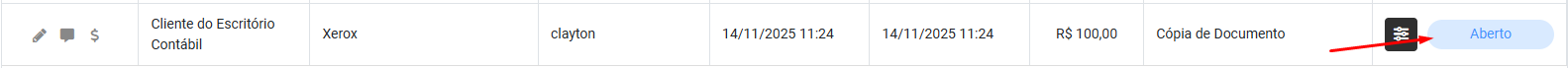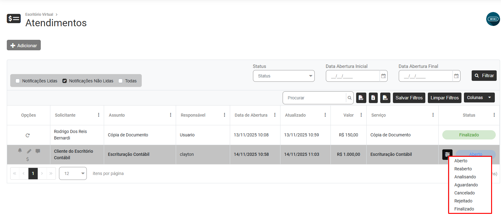 Você poderá alterar o Status do Atendimento, clicando no botão existente do lado esquerdo do Status e mudando para