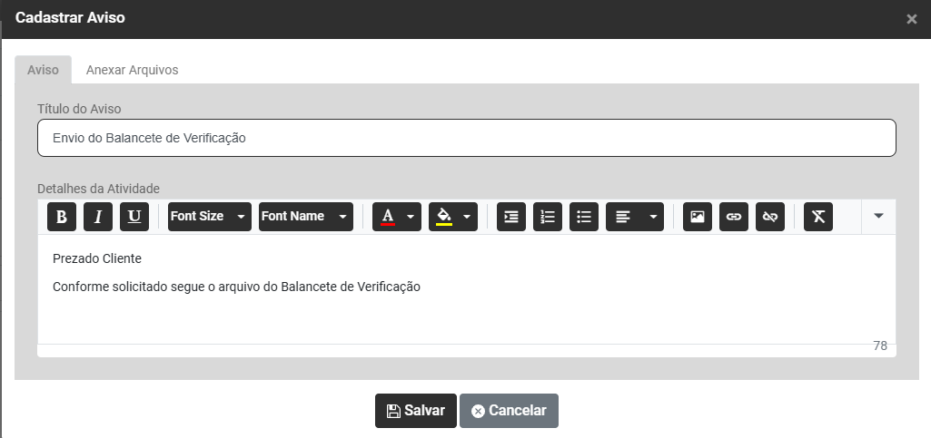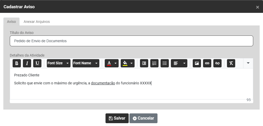 Ao acessar o botão Adicionar Avisos você encontrará duas abas - Aviso e Anexar Arquivos