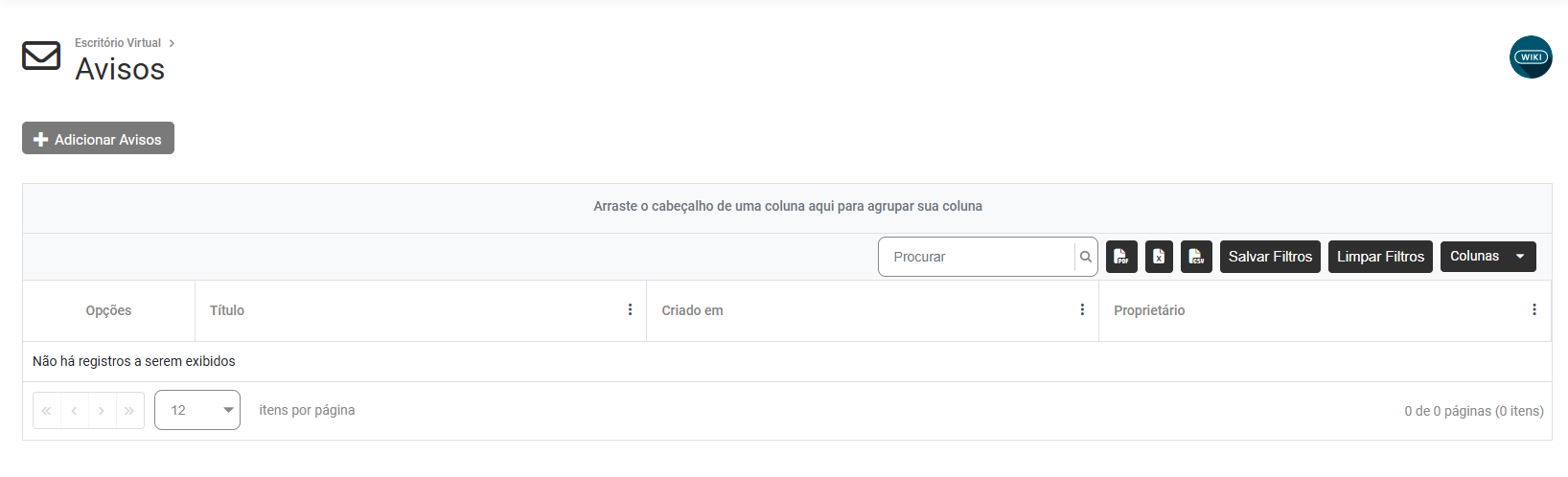 Na parte superior da tela você encontrará o botão Adicionar Avisos