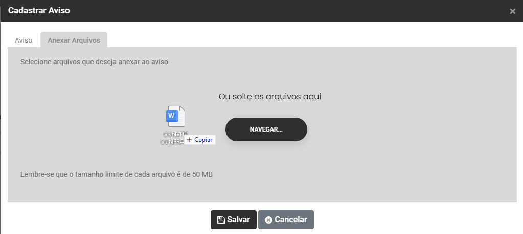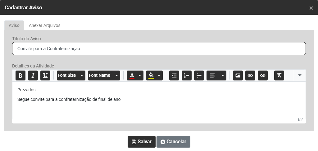 Ao acessar o botão Adicionar Avisos você encontrará duas abas - Aviso e Anexar Arquivos