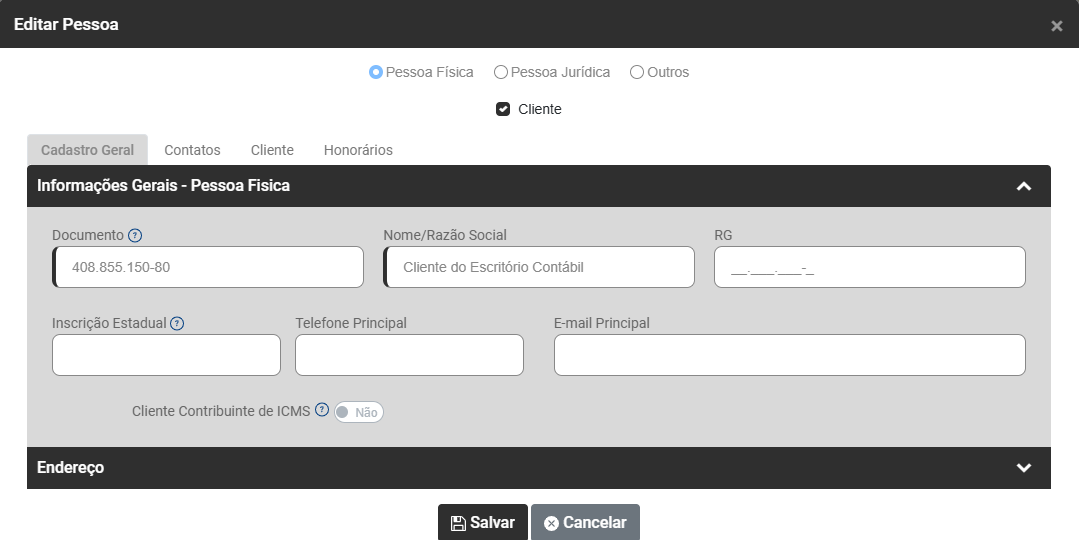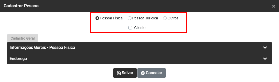 - Se é um Cliente Pessoa Física, Pessoa Jurídica ou Outros - as informações seguintes serão baseadas nesta definição